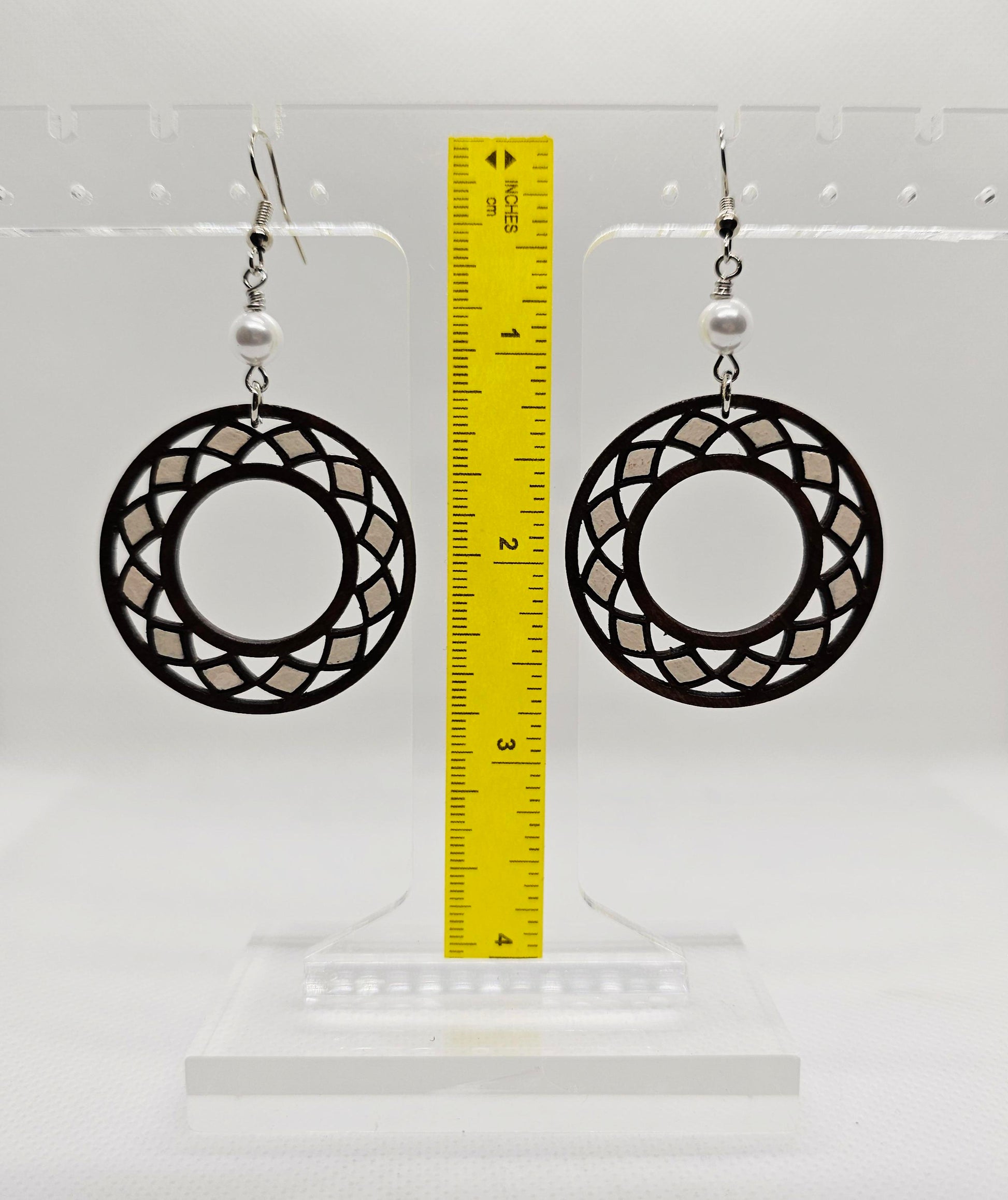 Hand-Painted Brown and Off-White Round Boho Laser Cut Wooden Lightweight Earrings