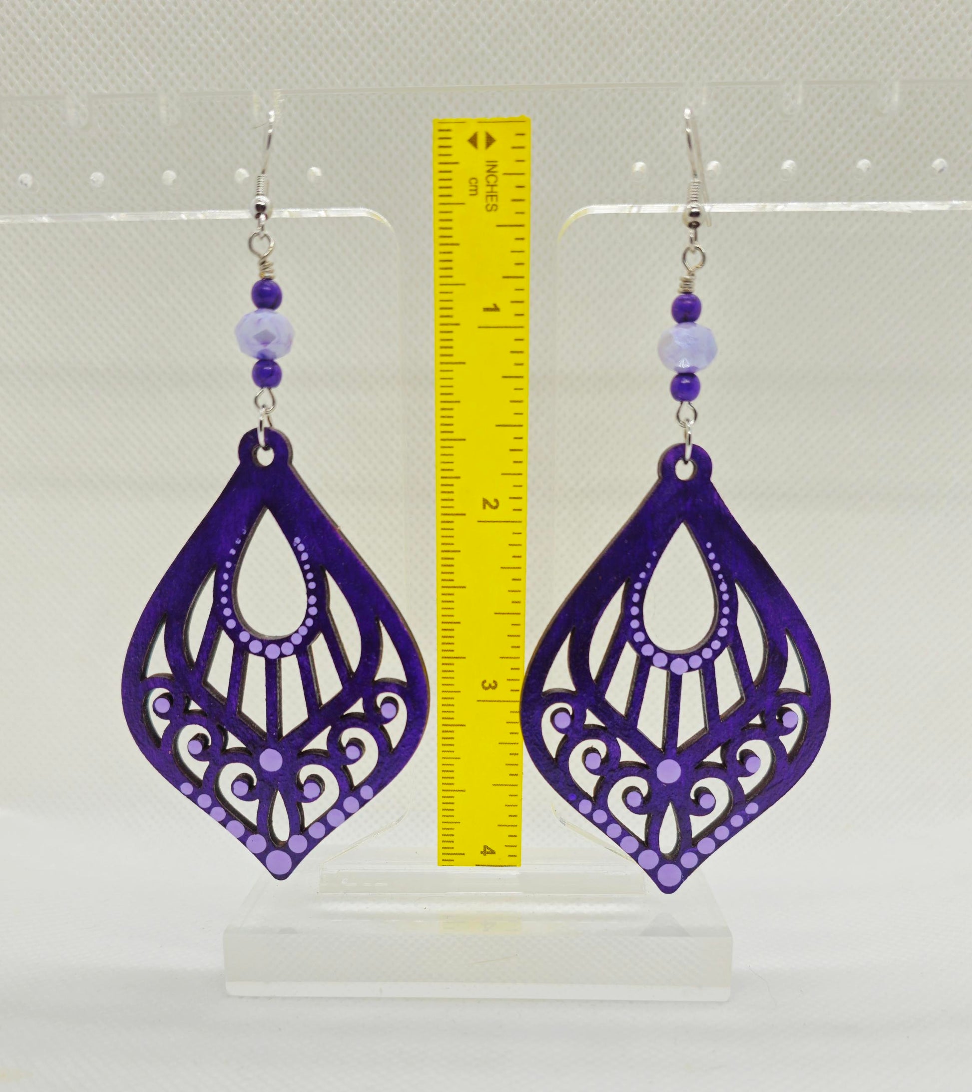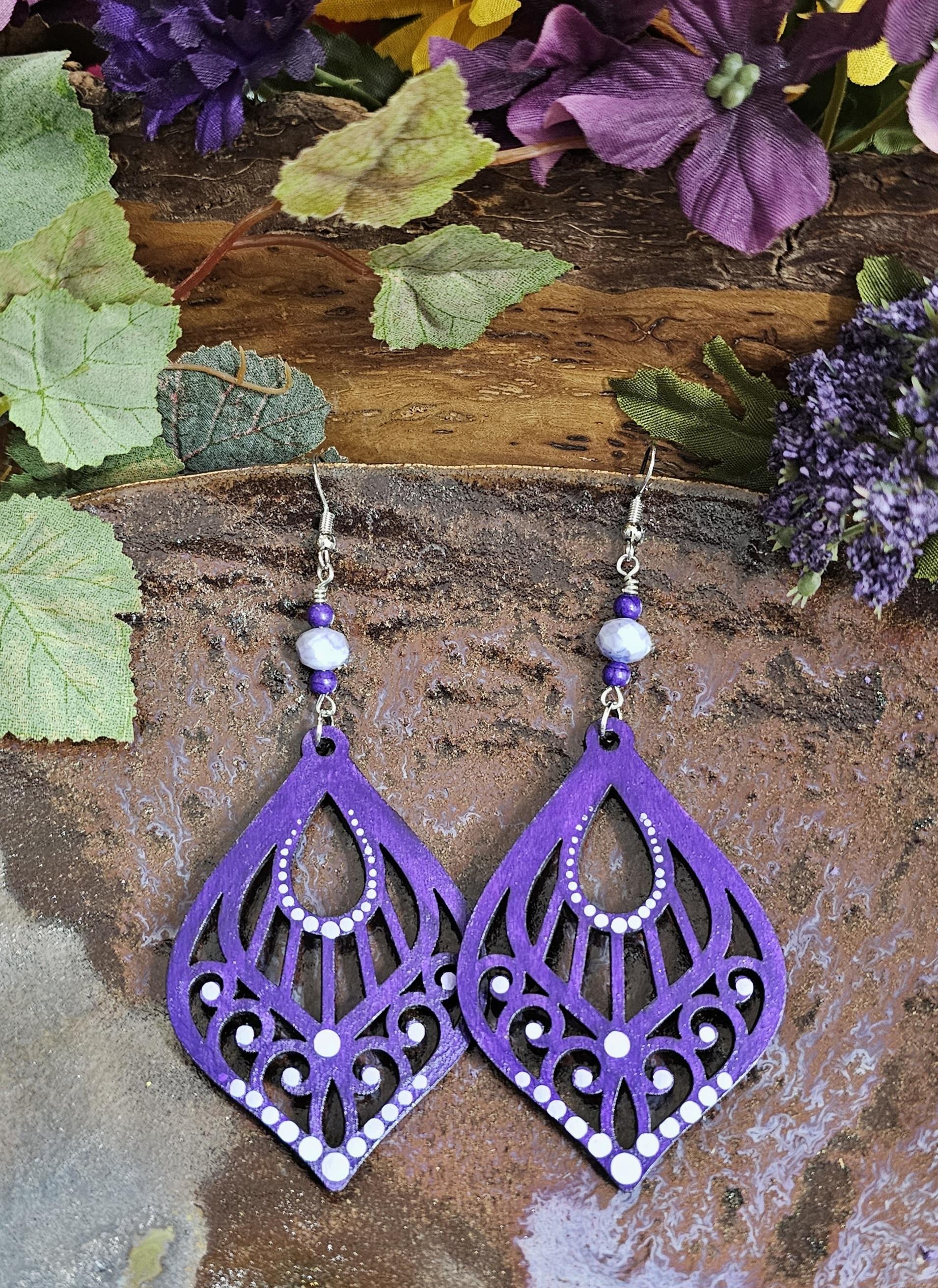 Hand-Painted Purple Color Teardrop Filigree Laser Cut Wooden Lightweight Earrings