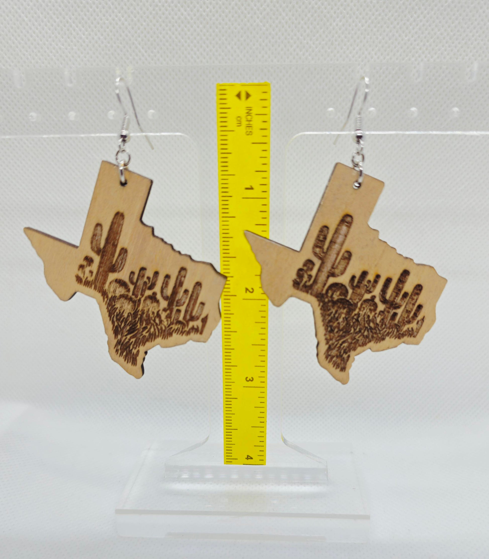 Texas Shaped Cactus Landscape Laser Engraved Wooden Lightweight Earrings