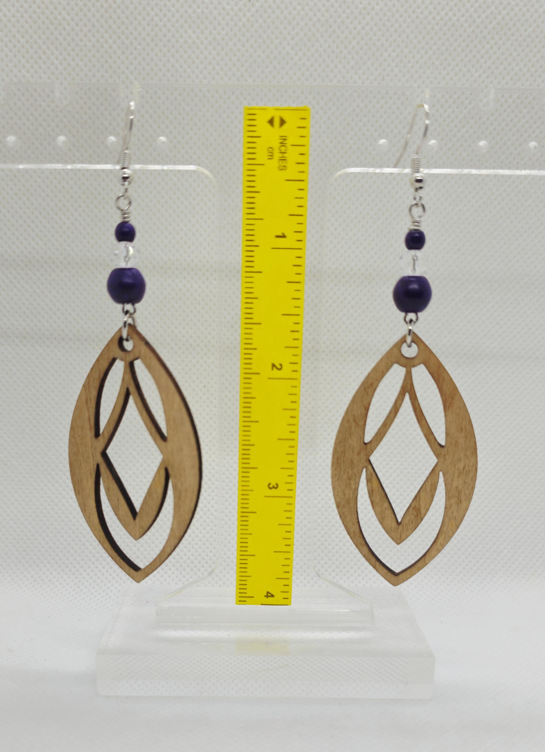 Wood Stained Dark Purple Beads Boho Teardrop Laser Cut Wooden Lightweight Earrings